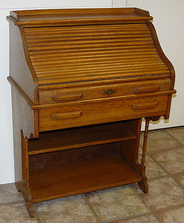 DIMINUTIVE GOLDEN OAK ROLL TOP DESK: Early 20th C. ''S'' curve roll top, interior pigeon holes and cubicles, full length exterior drawer. All this over open shelving. 40''h. x 28'' x 18'' overall.