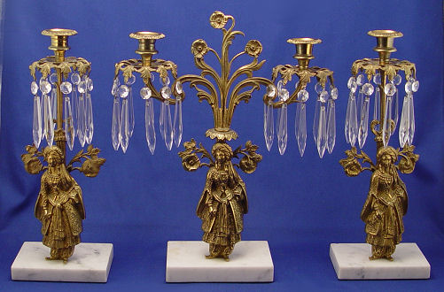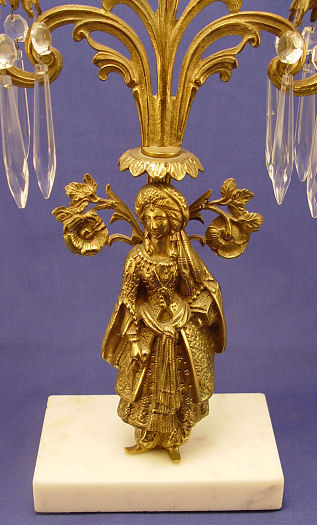 BRASS AND CRYSTAL GIRONDEL: Figural brass candle holders, crystal prism drops, on white marble bases. Approx. 15''h.