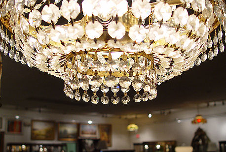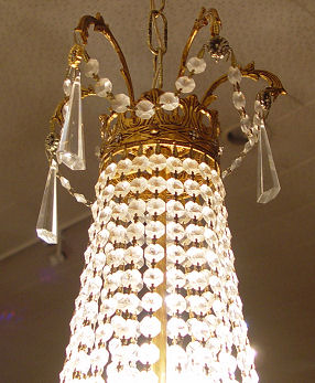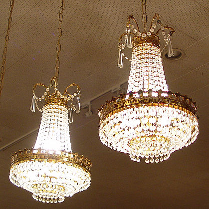 PAIR of DIMINUTIVE CRYSTAL CHANDELIERS: Matched pair with three lights in center surrounding the draped prism chains. Approx. 17 1/2''h. x 14'' dia.