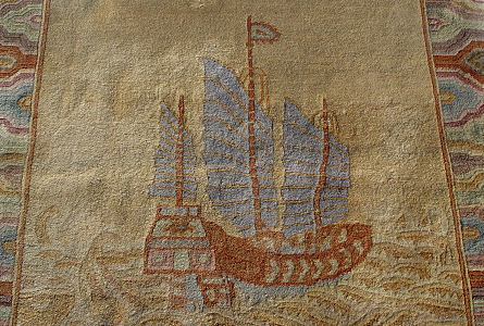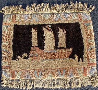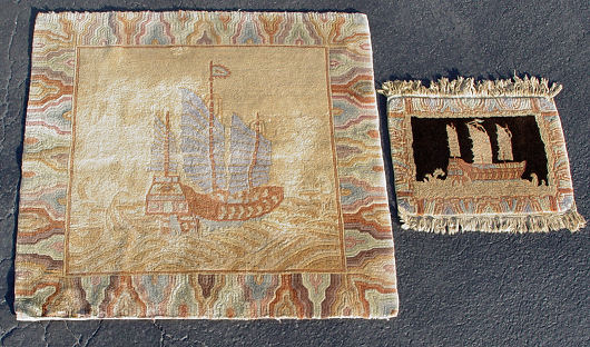 2 ESTATE FRESH PICTORIAL HAND TIED RUGS: Each centering the image of a sailing ship or boat. 46'' x 49'' and 18'' x 25''.