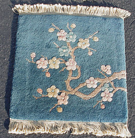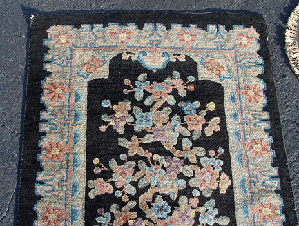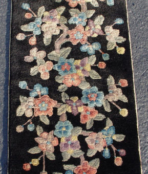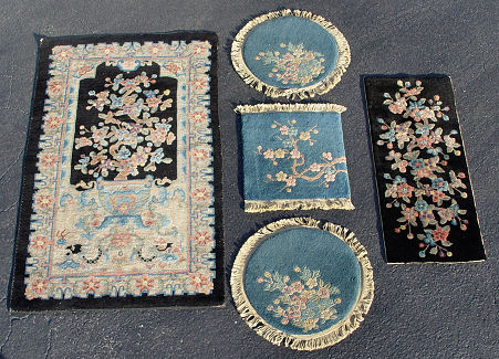 ESTATE GROUP OF 5 HAND TIED CHINESE RUGS: To include 1) Flower urn on black ground, 57'' x 35''. 2) sculpted floral on black ground, 39'' x 16''. 3 and 4) a pair of 19'' dia. round sculpted mats with fringe 5) Matching the mats is an 18'' square mat with fringe.