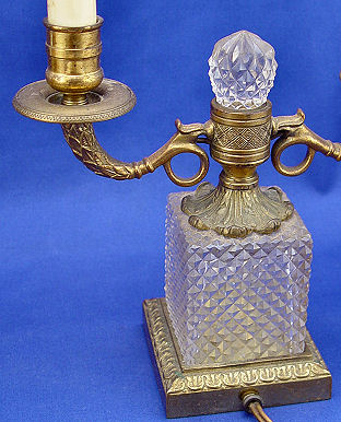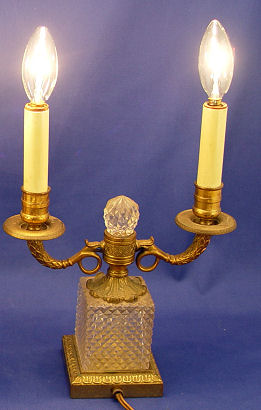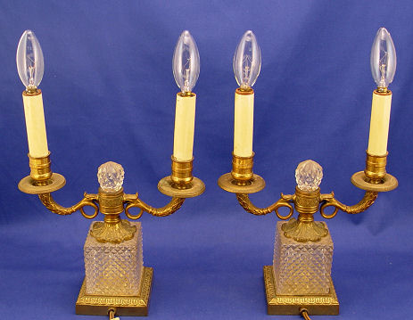 PAIR OF FRENCH BRONZE AND CRYSTAL VANITY LAMPS: 2 ''candle'' lights on each, 11''h, 11 1/2''w.