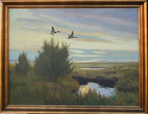 HOYRUP, Carl, (Danish, 1893-1961): Mallards in flight, O/C, 28'' x 38'', signed LR, worn frame, 32'' x 43''.