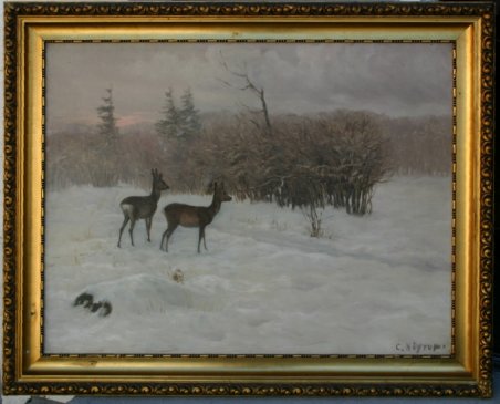 HOYRUP, Carl, (Danish, 1893-1961): Deer in winter landscape, O/C, 27'' x 35 1/2'', signed LR, worn frame, 32'' x 43''.