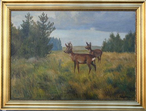 HOYRUP, Carl, (Danish, 1893-1961): Deer in summer field, O/C, 26 1/2'' x 38 1/2'', signed LR, worn frame, 32'' x 44''.