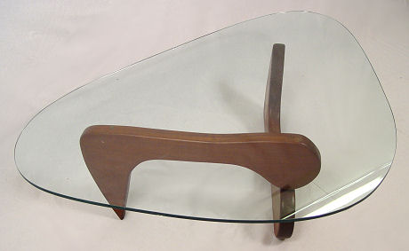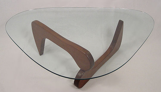 NOGUCHI STYLE GLASS TOP COFFEE TABLE: Glass top is approximately 49 1/4'' l. x 39'' w. x 3/8'' thick, wood base is 14 1/4'' h.