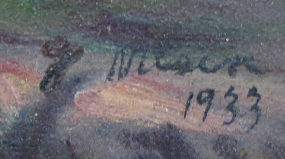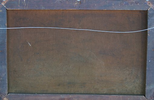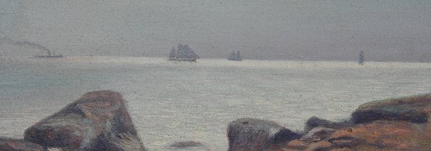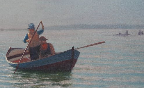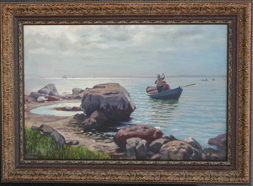 HARBOR SCENE O/C WITH FIGURES, STEAMSHIP AND BOATS IN THE DISTANCE: 20'' x 30'', fine contemporary framing, 26 1/2'' x 36 1/2''.