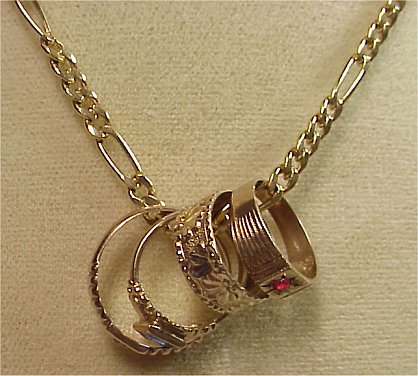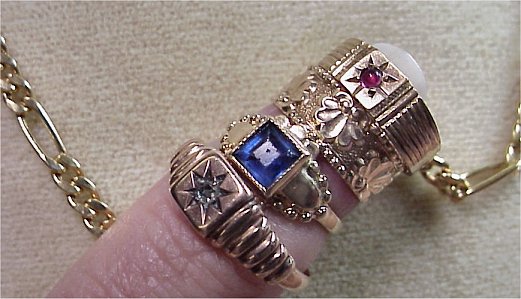 BABY RING NECKLACE: Four baby rings on a 14k gold figaro chain. The one with red stone marked 10k (.6 grams), the other three assay at 18k (2.6 grams total). Three smallest are the size of the very end of my sizer, the bigger one is size 3.25. Italian chain is 18''l, 5 grams.