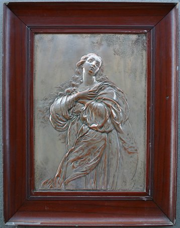 19TH C GERMAN RELIEF PLAQUE OF A MAIDEN: 15 1/2'' x 20 1/2'', impressed mark LR Geislingen?, worn wooden frame, 27 1/2'' x 22''.