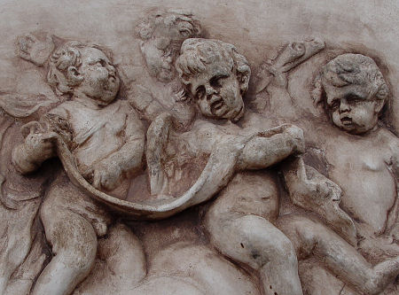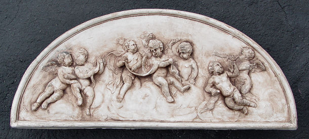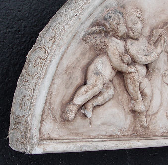 PLASTER BAS RELIEF PUTTI AND CHERUBS: Arched shape, 19''h. 44 1/2''l.