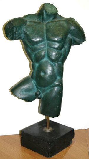 CARVED SCULPTURE OF A NUDE MAN: ''PROMETEO'', signed Lombourg, and dated '87, 23'' h., polished black stone base.