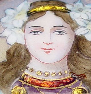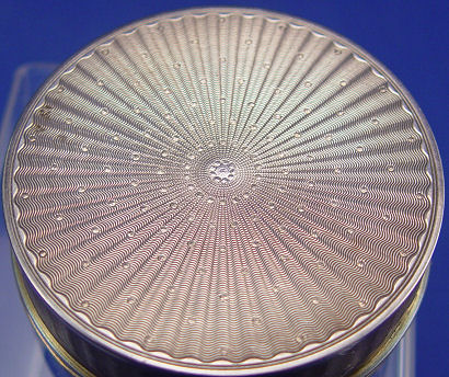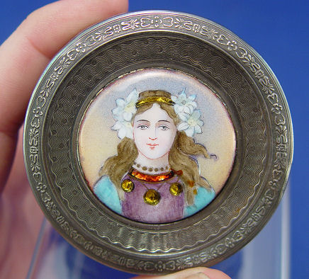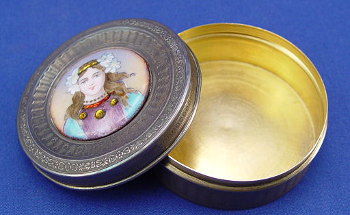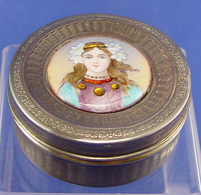 BELLE EPOCH FINE FRENCH SILVER AND ENAMEL BOX: The top centering enamel image of a maiden, gold wash interior. Boar head mark Paris assay office ca. 1838-1961, 800 silver. 1''h., 2 1/2'' dia.