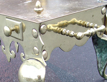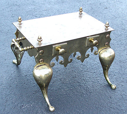 QUEEN ANNE BRASS AND IRON FIRESTOOL: Cast iron legs, brass seat and shaped apron. 19'' h. x 12 1/2'' x 18 1/4'' overall.