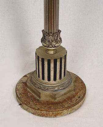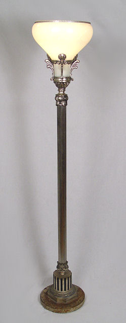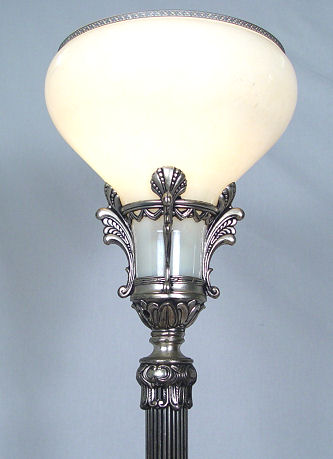 SILVERED TORCHIERE LAMP: Silvered metal floor lamp with luster opaque glass shade, 64 1/2''h.