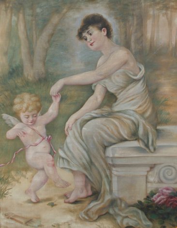 NEOCLASSICAL PAINTED TAPESTRY: Cupid and Maiden, 52'' x 41''.