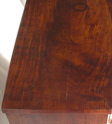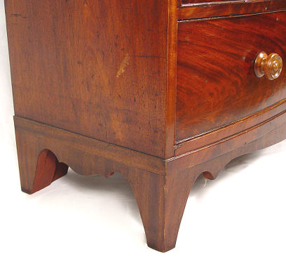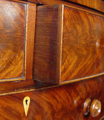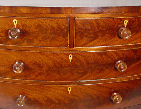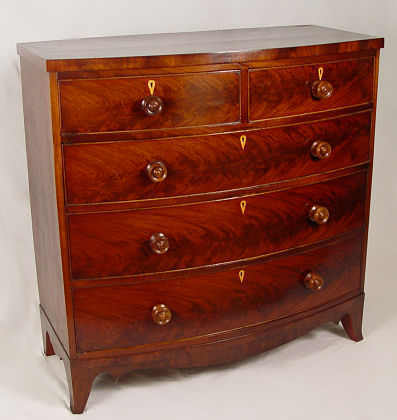 19TH C CROTCH GRAIN MAHOGANY SWELL FRONT DRESSER: Richly grained 2 over 3 drawer chest, 43'' h. x 43'' w. x 20'' d.