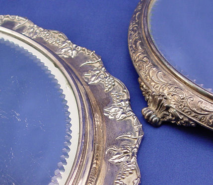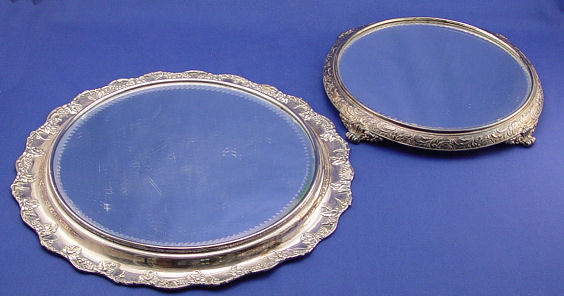 2 VINTAGE SILVERPLATE MIRROR PLATEAUS: The larger has wide grapevine designed edge, both are marked ''The Van Bergh S.P.C.O.'', the smaller plateau is stamped ''quadruple plate''. Larger plateau is 15 1/2'', mirror is 9 1/2'' dia., smaller plateau overall 12 1/2'', 11 1/2'' mirror.