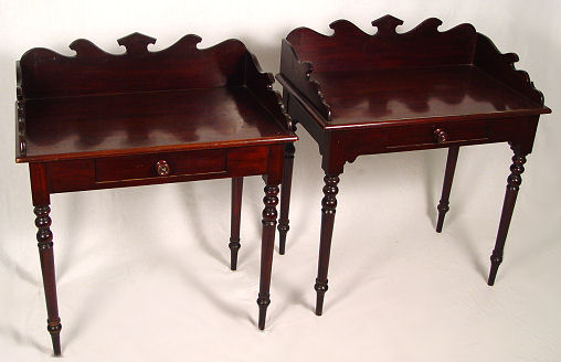 RARE 19TH C MATCHED PAIR MAHOGANY DRESSING TABLES: His and hers, single drawer stand with shaped backsplash. Sizes respectively are 28 3/4'' h x 32 1/4'' x 18 1/8'' and 28'' x 31'' x 18''.