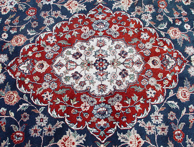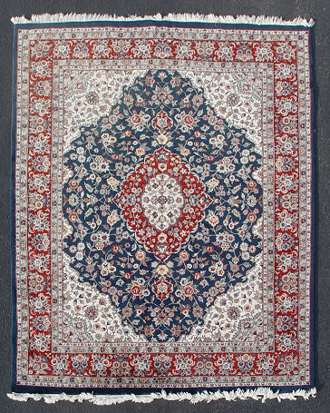 HAND WOVEN ORIENTAL CARPET: Approx. 7'11'' x 10'2'', plush wool and cotton carpet with blue ground red center medallion and matching border.