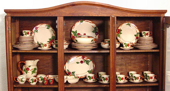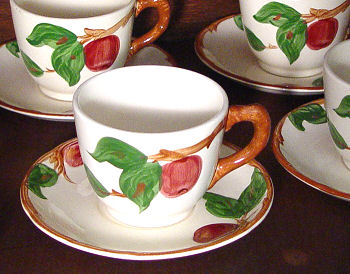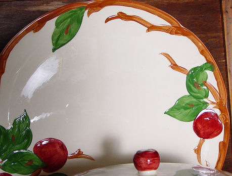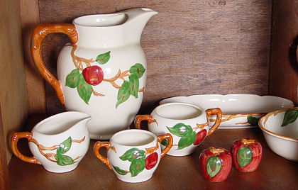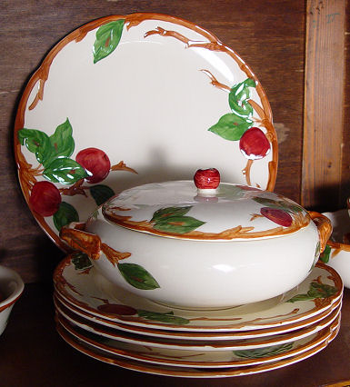 FRANCISCAN ''APPLE'' DINNERWARE SERVICE: 77 pieces to include 13 dinner plates, 5 salad plates, 16 bread plates, 13 cups, 20 saucers, a 14'' platter, covered vegetable bowl, 2 open vegetable bowls, a round chop platter, 2 open sugar bowls, cream pitcher, and salt and pepper shakers. Made in California.