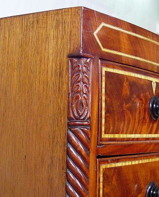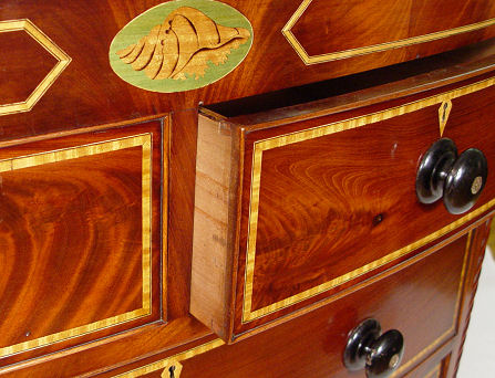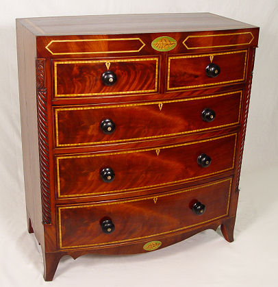 BANDED AND SHELL INLAY 19TH C SWELL FRONT CHEST: Richly grained mahogany 2 over 3 drawer chest, splay feet. 44 1/2'' h x 39 3/4'' w x 20 1/4'' d.