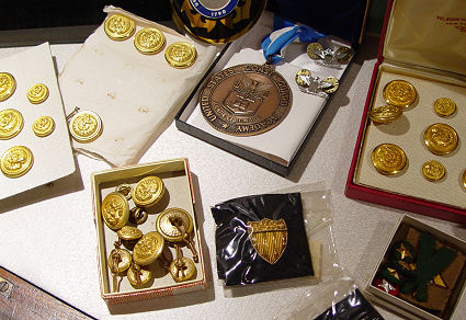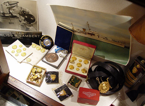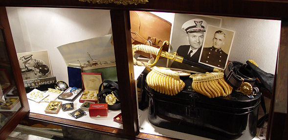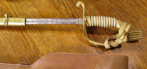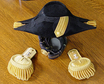 USCG DRESS HAT, EPAULETS, BELT & SWORD: The sword blade in engraved with the name Carliss Lambert (chief of staff Governor's Island NY in the 60's), ornate gilt metal handle and hilt, the sheath is leather and gilt metal. The dress hat and epaulets are in the original tin box. Accompanied by photographs of Capt. Lambert.