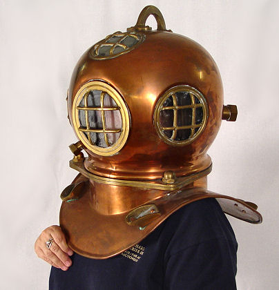 COPPER AND BRASS DIVER'S HELMET: No mark noted, approx. 19''h., 17 1/2''w. at shoulder base.
