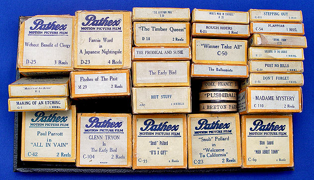 29 PATHEX MOTION PICTURE FILMS: With 26 in original boxes. Titles include Fannie Ward in ''A Japanese Nightingale'', Stan Laurel in ''Man About Town'', Glenn Tryon in ''The Early Bird. The boxes are in good condition for the most part. Please call for details or check photo for titles.