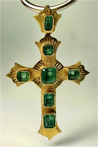 EMERALD & 18K GOLD CROSS: Approx. 2ctw of bezel set emeralds set in cross of 18k yellow gold, 2''l, 4 grams.