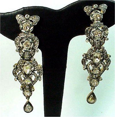 GEORGIAN STYLE DIAMOND DANGLE EARRINGS: Mixed gold and silver construction with foil backed diamonds, approx. 5.5ctw, I1 clarity L-M color, 2 1/2''l., approx. 18 grams total. Est. $2000/3000**