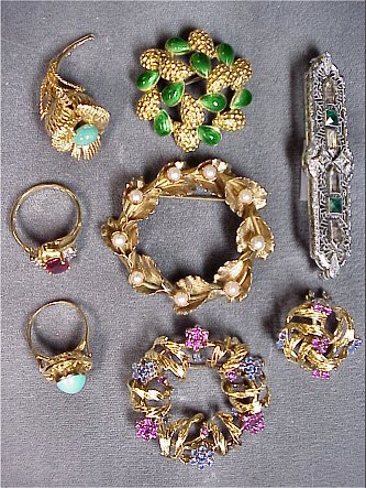 WONDERFUL LOT OF ESTATE JEWELRY: Brooches and rings to include, 18k yellow gold circle brooch with green enameled petals alternating with textured petals, 1 1/4'', 11 grams; 18k Italian gold wreath brooch set with sapphire & ruby flowers, 1 3/8'', with one matching earring, 18 grams total; 14k gold flower pin set with turquoise?, signed Scalle, 6 grams; gold filled pearl circle pin; costume filigree bar pin set with white and green rhinestones; 14k ring set with turquoise cabochon on Greek key gallery, size 4.25, 2.6 grams; and a 10k gold ring set with red stone, size 7.25, 2 grams. Sold as a lot.