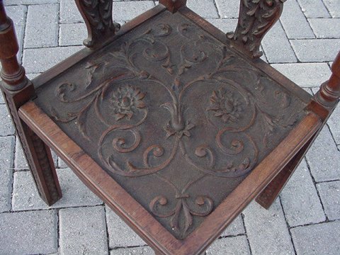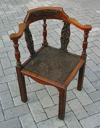 WALNUT CHILD'S CORNER CHAIR: Carved floral design in seat. Seat is 14 12'' h. and overall height is 26 1/8, seat size is 14 5/8'' x 14 5/8''.