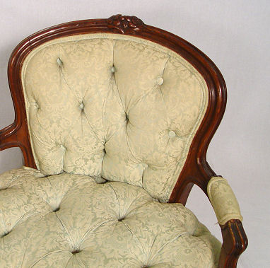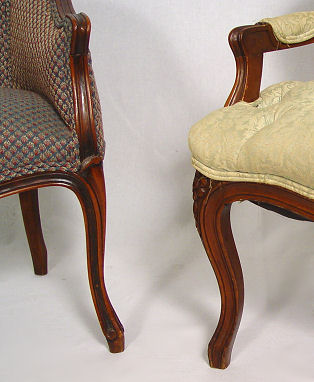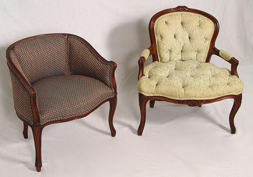 2 CHILD SIZE FRENCH BERGERE CHAIRS: 1) Open arm Louis XV style chair with tufted seat and back, carved frame 27''h. x 25''w. 2) Bergere chair with molded walnut frame, 23''h. 22 1/2''w.