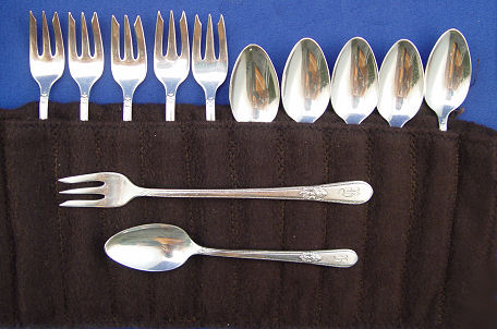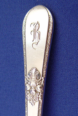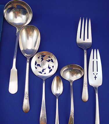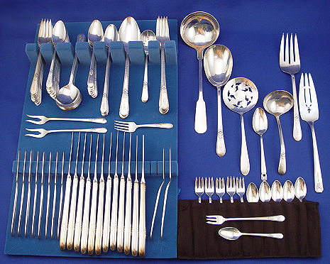 ROGERS BROS SILVERPLATE FLATWARE IN THE ''ADORATION'' PATTERN: 108 pieces to include 12 grill knives, 12 grill forks, 12 salad forks, 6 cocktail forks, 24 teaspoons, 6 demi-tasse spoons, 6 iced tea spoons, 6 soup spoons, 3 tablespoons, 2 master butters, 8 butter spreaders, gravy ladle, olive fork, sugar spoon, relish spoon, casserole spoon and cold meat fork, monogrammed ''B''. Sold with a few bonus extra pieces in mixed patterns.