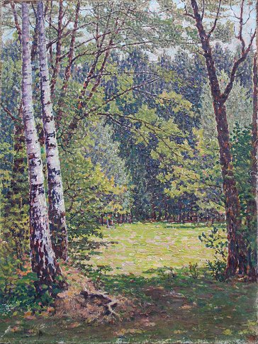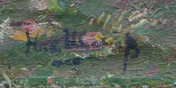 IMPRESSIONIST O/C/B MEADOW PAINTING: Signed LL illegibly, 18'' x 14'', fine contemporary framing, 25'' x 21'', Russian labels affixed verso.