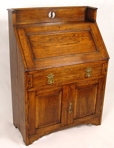 AN OAK BRITISH SLANT FRONT BUREAU DESK: Interior cubicles, overall 46 1/2'' h., writing surface of desk is 29'' h. x 32 1/4'' w. x 15 1/2'' d.