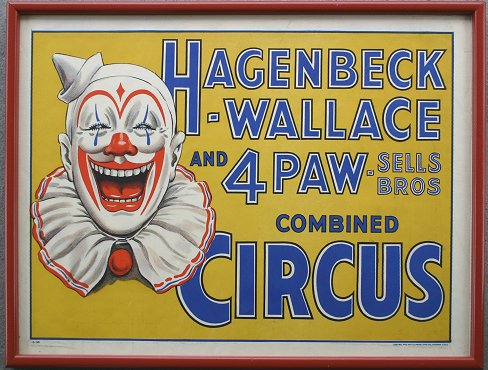 HAGENBECK-WALLACE AND 4 PAW-SELLS BROS CIRCUS POSTER: 20'' x 27'', smiling clown on yellow ground.