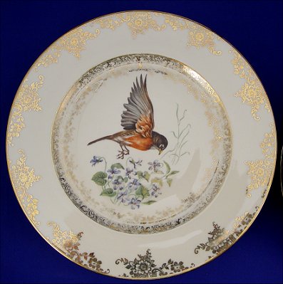 SET OF 12 HEINRICH BAVARIAN SERVICE PLATES: Gold lacy decorated border centering an image of bird and fauna. 11 1/4'' dia.