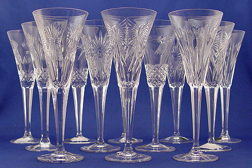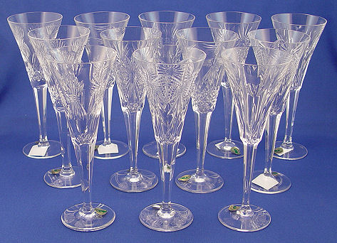 12 WATERFORD CRYSTAL MILLENNIUM COLLECTION TOASTING FLUTES: Celebrating Universal toasts for Love, Happiness, Prosperity, Peace, and Health. Sold in the boxes, with two to a box. 9 1/4''h.