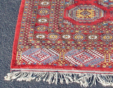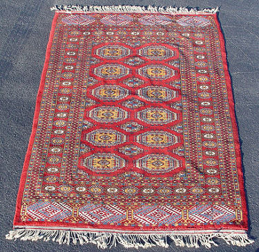 BOKHARA CARPET: Approx. 5'11'' x 4'2'', geometric pattern on red ground.
