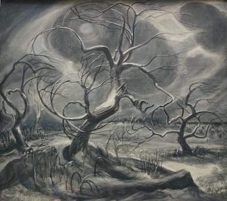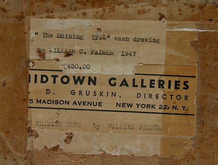 PALMER, William C., (American, 1906-1987): ''Shining Tree'', Clinton, New York, Wash Drawing, 20'' x 22'', signed bottom mid-margin, titled verso and dated 1947, painted wood frame, 29 1/2'' x 32'', Midtown Galleries label affixed verso.