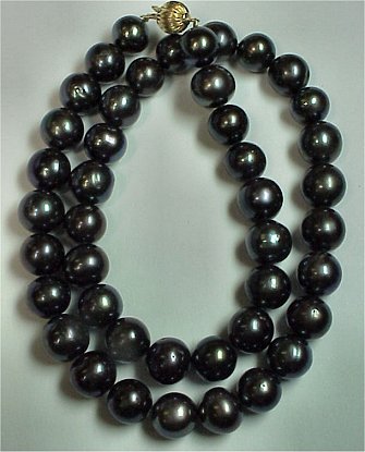 16'' STRAND OF 9MM NATURAL BLACK CULTURED PEARLS, 14k CLASP