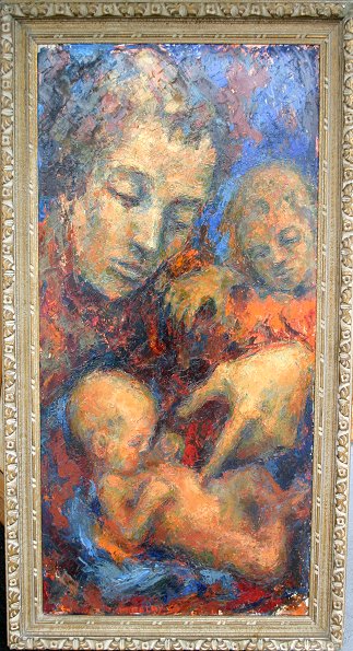 GELBY, M., (American, 20th C.): Mother and children, O/B, 48'' x 24'', signed in the lower margin, dated '56, gesso frame, 54'' x 30''.