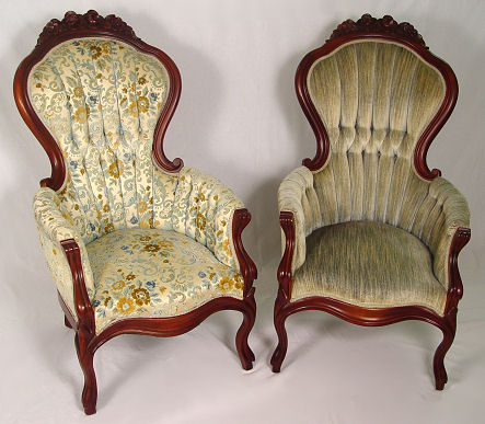 PAIR VICTORIAN PARLOR CHAIRS: Flower carved crest on matching frames. Channel tufted upholstery on each compliments the other. 44''h. x 26''w.