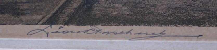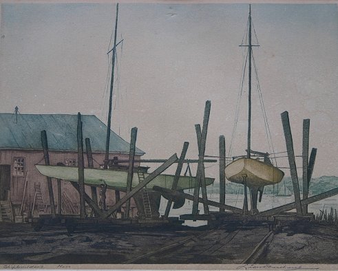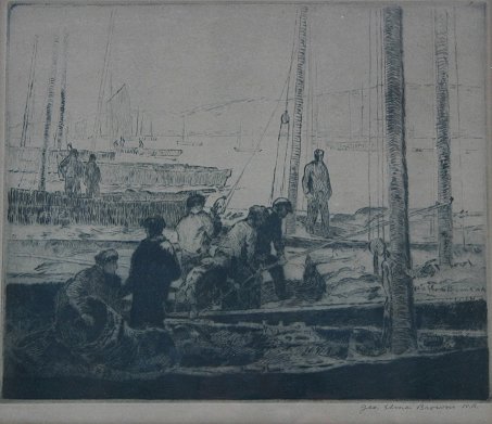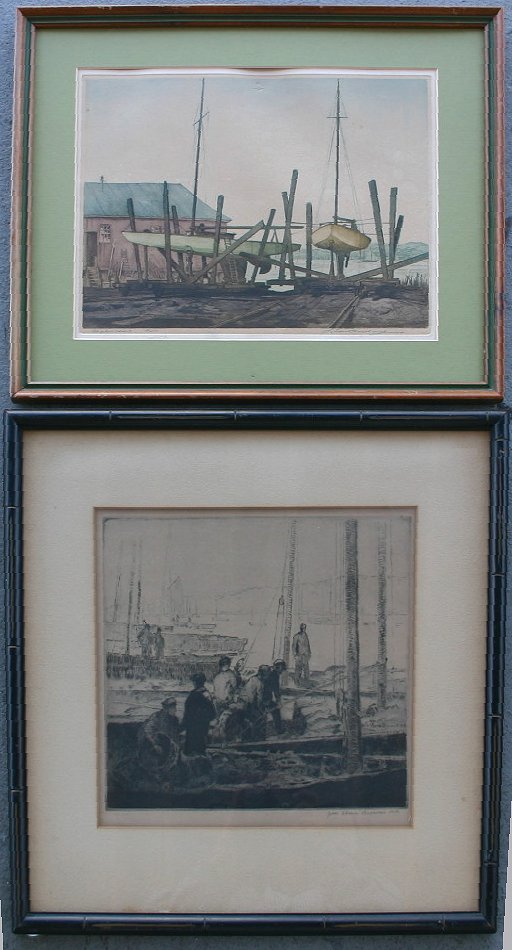 BROWN, George E., (American, 1871-1946): Dockworkers, Etching, 11'' x 12 1/2'' sight size, signed in pencil LR, worn black frame, 18'' x 19 1/2'', SOLD WITH: PESCHERET, Leon, (American, 1892-1961): ''Shipbuilders, Mass.'', Aquatint, 11 1/4'' x 14 1/4'' sight size, signed LR, worn wood frame, 15 1/4'' x 19 1/4''.
