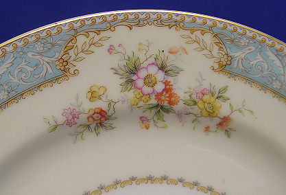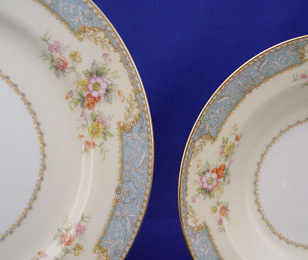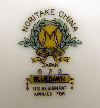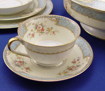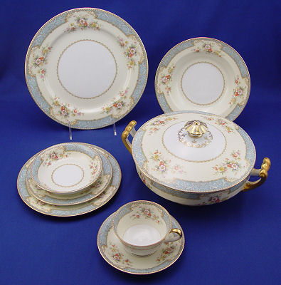 NORITAKE ''BLUEDAWN'' FINE CHINA DINNER SERVICE: 65 piece service to include 8 dinner plates, 8 salad plates, 12 bread plates, 12 dessert bowls, 8 soup bowls, 6 cups, 8 saucers, an 11'' platter, 1 round open serving bowl, 1 oval open vegetable bowl, 1 covered vegetable bowl, cream pitcher, covered sugar, and gravy boat.