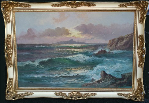 F. WALLIS, CRASHING SURF AT SUNSET: O/C, 24'' x 36'', signed LL, painted frame, 30'' x 42''.
