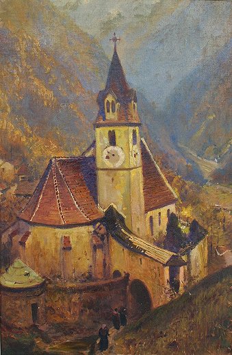MOUNTAINOUS LANDSCAPE WITH MONASTERY: 36'' X 24'', signed LR HUN?, carved frame, 44'' x 32''.