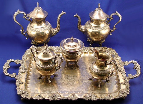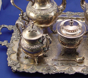 BIRMINGHAM SILVER CO PLATED TEA SERVICE WITH TRAY: Grape vine decoration on 6 piece set to include 26 1/2'' tray (incl. handles), coffee and tea pots, creamer sugar, and waste bowl.