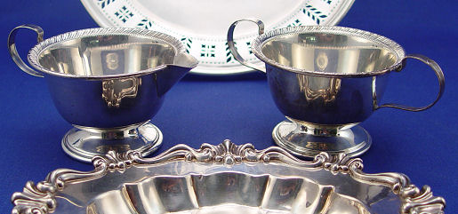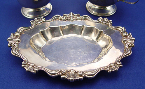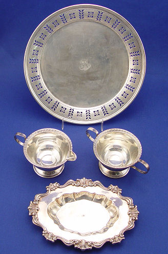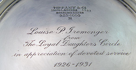 3 PIECE ESTATE STERLING GROUP INCLUDING TIFFANY: 1) A Tiffany & Co. (Makers) reticulated 9 1/2'' dia. sterling salver, monogrammed, inscribed verso to Louise Iremonger for devoted service to The Loyal Daughters Service 1926-1931, approx. 13.8 oz. 2) Black Starr & Frost sterling tray, 7 1/2''l, approx. 3.34 oz. and 3) a sterling creamer and sugar.